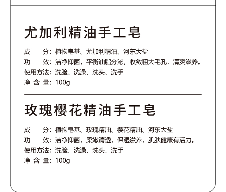 產品說明: 尤加利精油手工皂*1 玫瑰櫻花精油手工皂*1